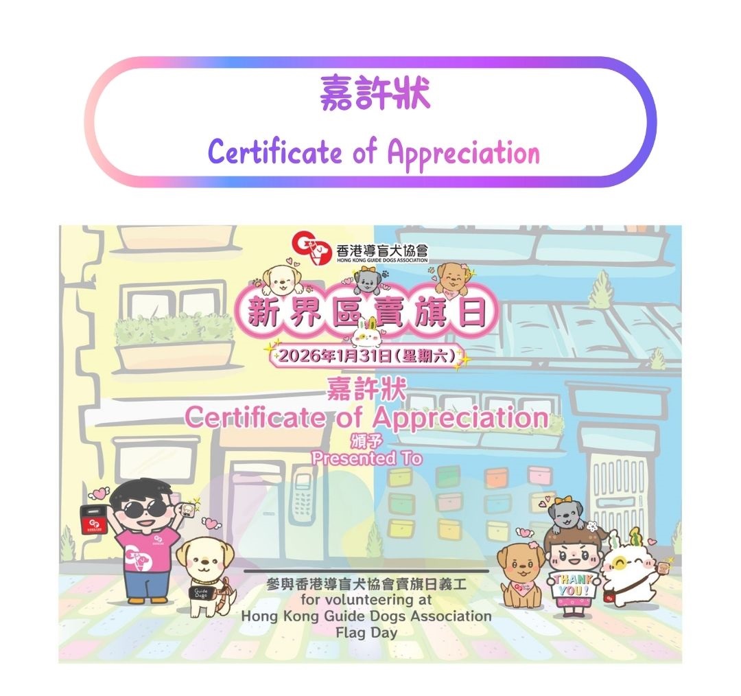 本會將致送電子義工嘉許狀給各完成賣旗活動之義工,以表謝意。