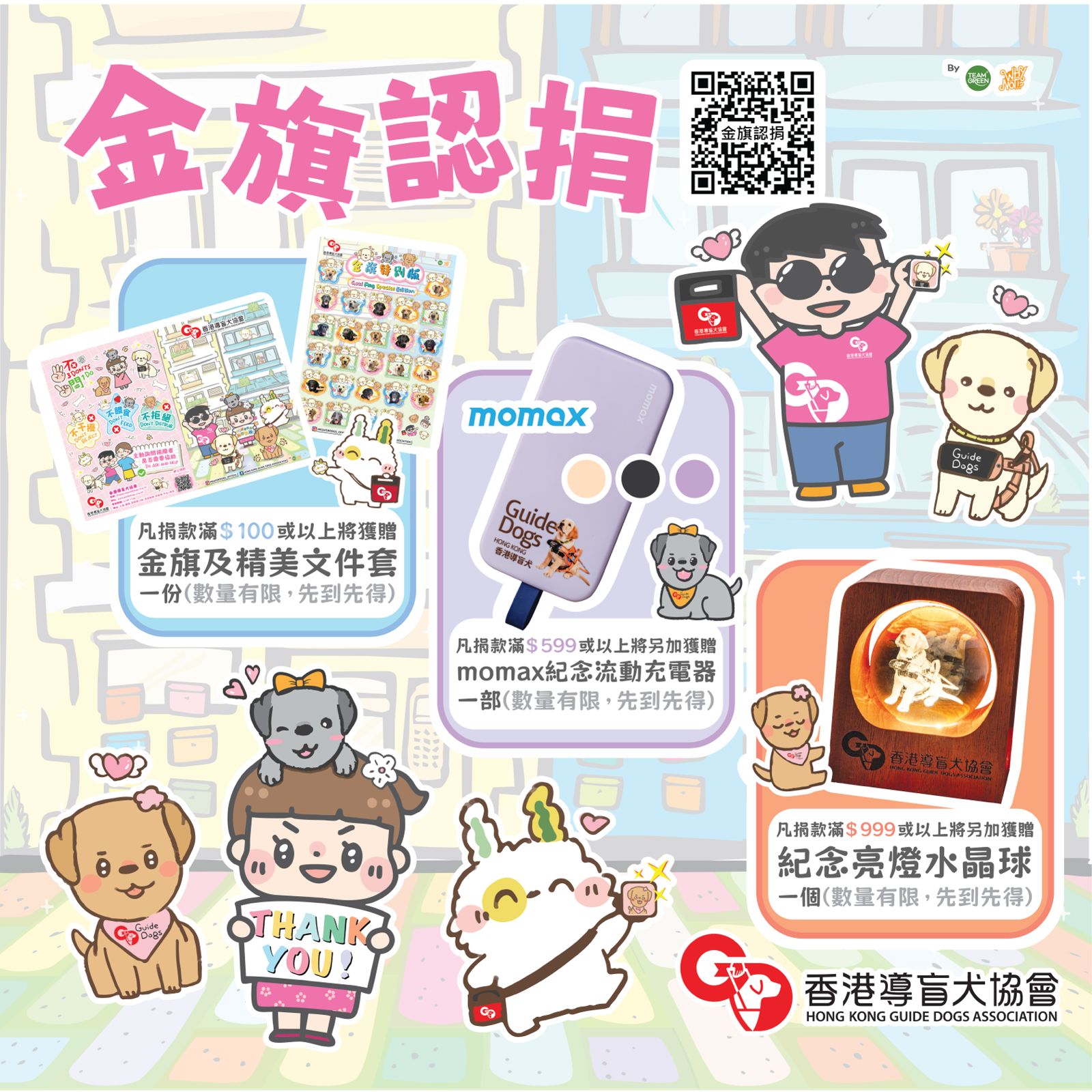 除了可獲贈香港導盲犬協會賣旗日旗紙全版和金旗特別版旗紙,以及精美文件套一份外,更可獲贈“香港導盲犬協會 x momax”之流動充電器一部!(數量有限,先到先得)